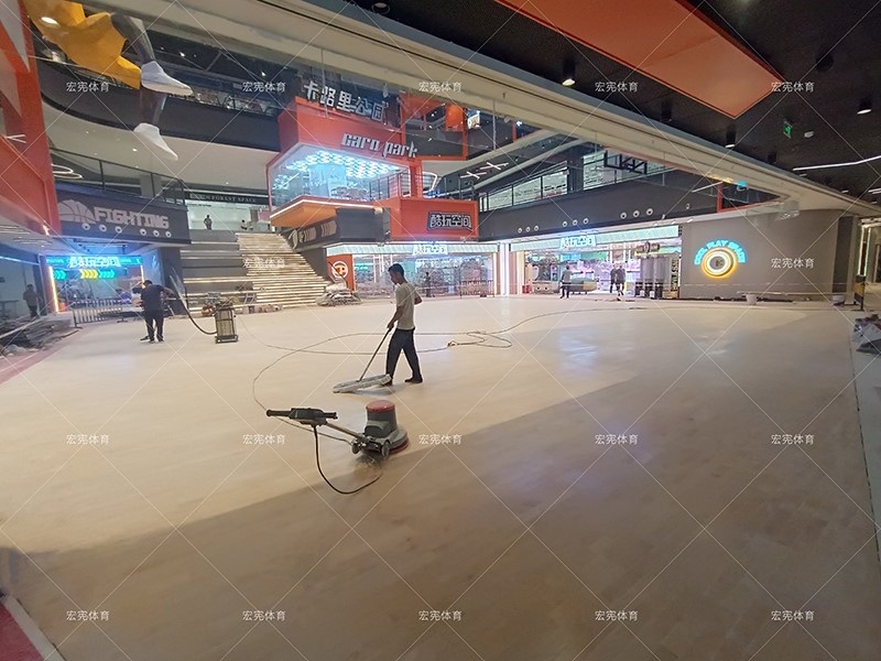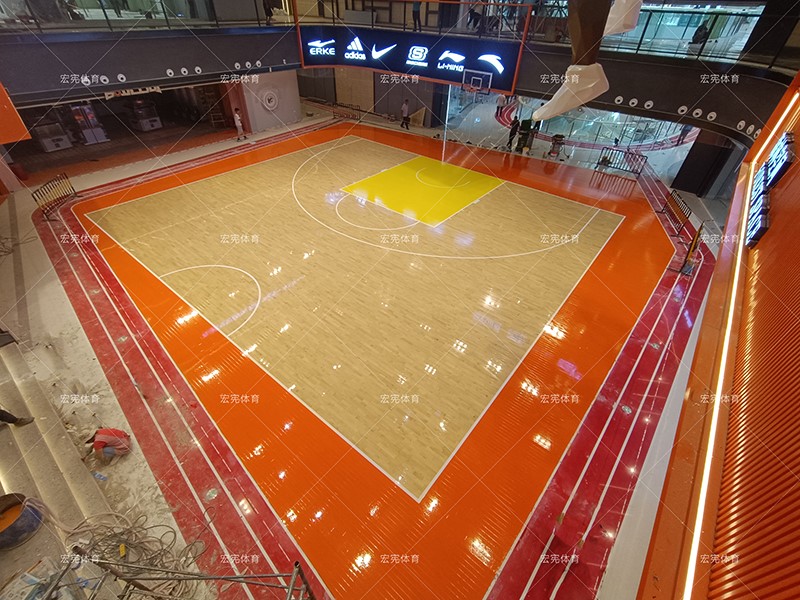 場地共400平米,雖然是一個半場,但是它的設計風格不亞于大型的體育場地,吾悅廣場整體以“”潮涌石澗、光照海岸“”作為意向,打造多層觀景退臺,營造開闊的視野。作為內部亮點之一的籃球館一定會迎來更多的駐足。該場館木地板采用現場上漆的工藝,以黃、橙、紅三種顏色來搭配,不僅與整體商場色調風格呼應,而且幾種顏色形成鮮明對比,更突出場館的活力與朝氣。場地對運動性能的要求也很高,采用宏憲SPTFL01結構,雙層減震膠墊,使打球的回彈性更高,減震吸收能力更好,而且層層結構都具有國家標準的檢測報告,使場地使用起來更加有保障。